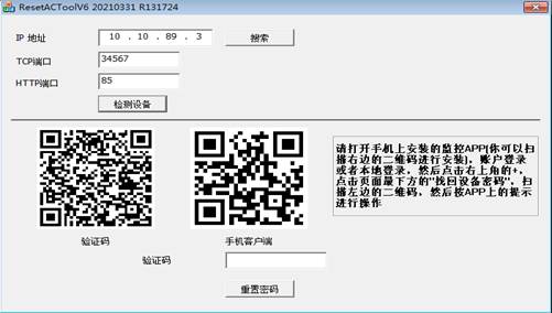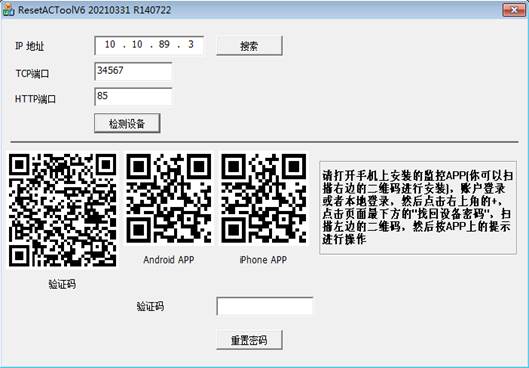 步骤二:检测设备类型 点击检测设备按钮,工具根据设备的实际情况呈现手机验证密码重置模式或者是telnet恢复默认账户模式。 三、手机验证密码重置模式 根据客户端下载模式的区别,认证模式有以下两个界面 1、认证模式一:  图3.1 Android和IOS客户端使用同一个APP 2、认证模式二:  图3.2 Android和IOS客户端使用不同的APP