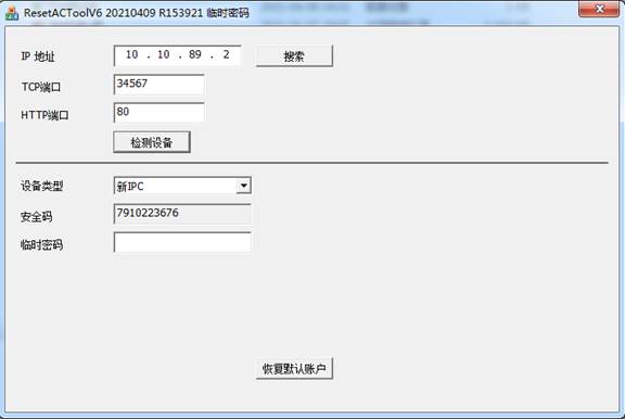 四、telnet恢复默认账户模式 telnet恢复默认账户模式,设备类型有3种:新IPC、老IPC和老DVR;一共有以下三种模式: 1、普通账户 将安全码发给技术支持(每次点击检测设备按钮后,安全码都会不一样,因此把安全码发给技术支持后就不要再次点击检测设备按钮),让技术支持提供临时密码,然后选择设备类型和输入临时密码,点击恢复默认账户即可。