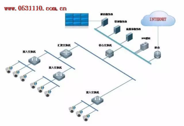 从网络拓扑结构上来讲,一个局域网通常是两到三层结构。接摄像机那端为接入层,一般用百兆交换机就够了,除非你在一个交换机上接了很多个摄像机。